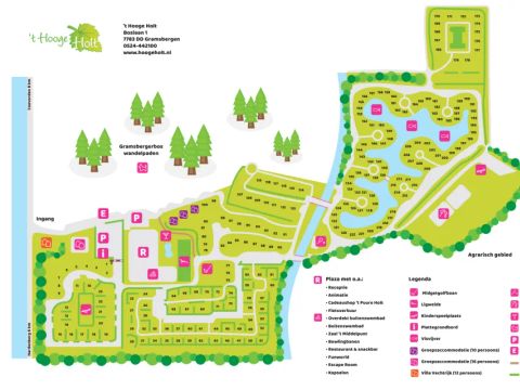 Die 't Hooge Holt bietet folgende Unterkünfte an: Chalet, Gruppenunterkunft, Bungalow. Siehe die Unterkünfte